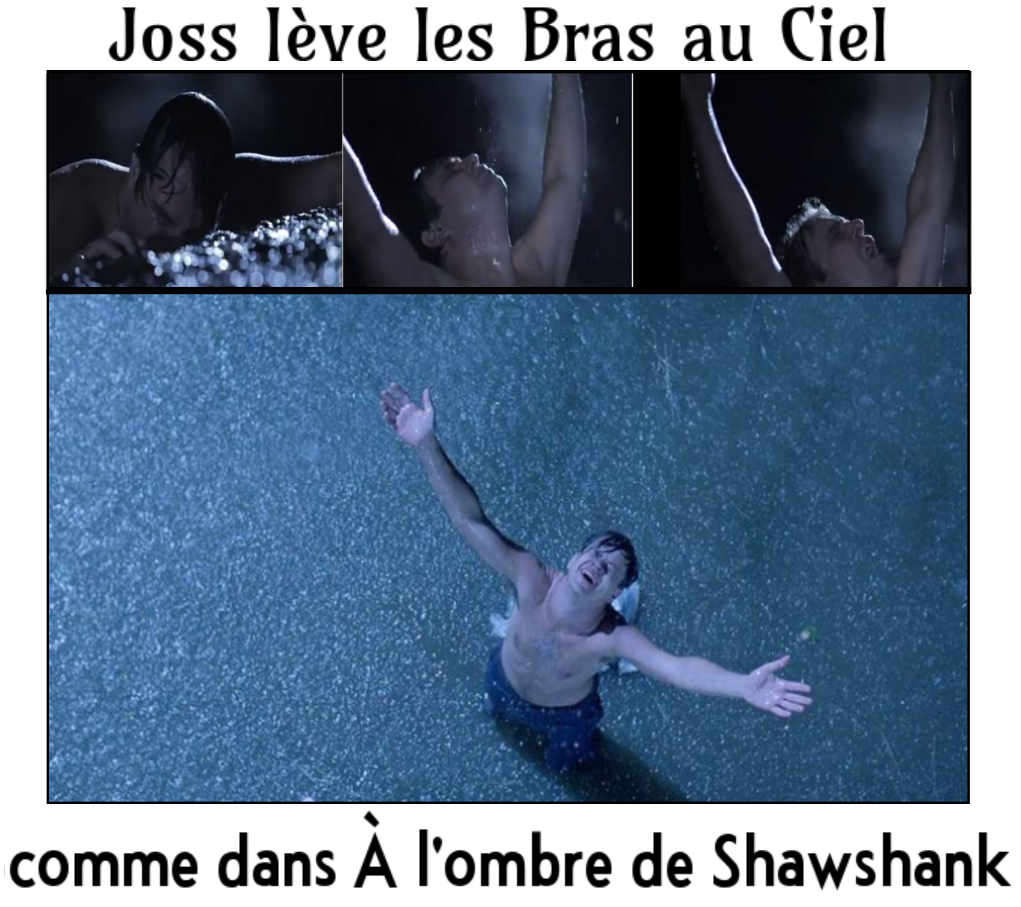 Dans les 3 images du Haut, il s'agit d'une reconstitution ou Joss pour survivre,se laisse transporter par les vagues et s'accroche par miracle à un rocher et après il se lève et met ses bras vers le Ciel et étrangement il a remarqué par la suite une ressemblance avec le Film À l'ombre de Shawshank ou Andy Dufresne(L'Acteur Tim Robbins) lève aussi ses Bras vers le Ciel suite à son évasion de Prison.(image du Bas)