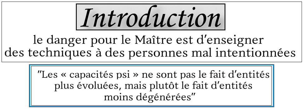 Les Pouvoirs touchent tout le monde et peut parfois éveiller des sentiments profonds et mitigés. Certains ne croiront pas, d'autres seront jaloux de voir les pouvoirs des autres dont ils sont dépourvus. D'autres encore pourraient devenir méfiants en sachant qu'il est possible, entre autre, de lire leurs pensées. Parler de POUVOIRS c'est passer à une phase très concrète de notre démarche ésotérique. Quels sont les véritables motifs derrière le désir d'acquérir des pouvoirs ? Comment faire passer une action du plan causal -NOUMÉNAL- au plan concret, matériel et visible -PHÉNOMÉNAL-?Le danger pour le maître est d'enseigner des techniques à des personnes mal intentionnées. Une fois connues la technique ne peut pas être retirer à l'élève. Le défi pour l'adepte est de maintenir son équilibre et ne pas devenir obsédé.Est-ce que tout le monde a des pouvoirs psioniques ? Non.Le simple fait d'avoir des mains ne fait pas de nous un pianiste.De la même manière, le simple fait d'avoir de l'Esprit ne nous procure pas des pouvoirs PSI.Une personne peut avoir la faculté sans en avoir les pouvoirs qui l'accompagne. Ainsi, quelqu'un peut avoir la faculté de se souvenir de ses rêves, de se projeter dans le temps et l'espace, de faire de la télépathie sans pour autant avoir le pouvoir de le faire.