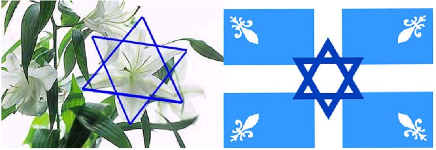 -Le 21 JANVIER 1948, le Fleurdelisé devient le drapeau officiel du Québec- ce drapeau aux quatre fleurs de lys.Pour les Hébreux, le lys était l’emblème des tribus d’Israël, ce qui s’explique par le fait que vue de haut, cette fleur épouse la forme de l’étoile de David, cette étoile se divisant en douze triangle équilatéraux, chacun représentant une des tribus.Est-ce vraiment un hasard si le Fleurdelisé fut adopté par le Parlement la même année que la création de l’État d’Israël en 1948 ? Ce n’est pas seulement la France qui légua la fleur de lys au Québec, mais aussi le peuple hébreu qui lui-même était l’héritier de l’ancienne Égypte.