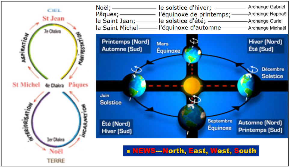 Ces Fêtes correspondent chacune à un moment où le soleil passe par un de nos quatre points cardinaux que sont : le Nord - le sud - l'Est - l'Ouest formant ainsi une CROIX.Ne dit-on pas des textes sacrés qu'ils annoncent la bonne Nouvelle car le jumelage des 4 premieres lettres des 4 point cardinaux en anglais donne le Mot NEWS.Aux fêtes cardinales, les portes sont grandes ouvertes sur toutes les sphères du monde invisible.