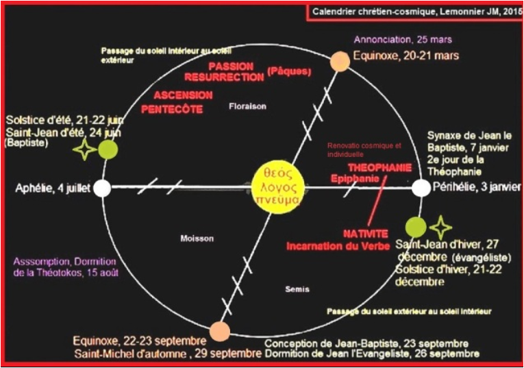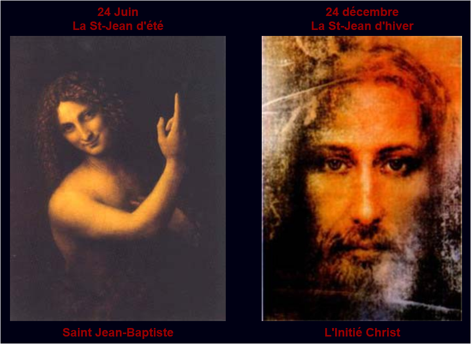 Le solstice d’hiver qui marque le moment le plus faible de la course cyclique du soleil, est aussi celui qui marque le retour des jours qui se rallongent et des forces solaires qui renaissent. Le solstice d’été quant à lui désigne le moment le plus fort de la course cyclique, alors qu’à partir de ce moment les jours diminuent et les forces solaires s’affaiblissent.Jean l’Évangéliste ouvre la porte hivernale et annonce le cycle d’illumination : la Nativité à la fin du cycle estival et, un peu plus tard, durant le cycle hivernal, la Résurrection du Christ. C’est pourquoi Jean l’Évangéliste rapporte lui-même dans son évangile les paroles du Baptiste :