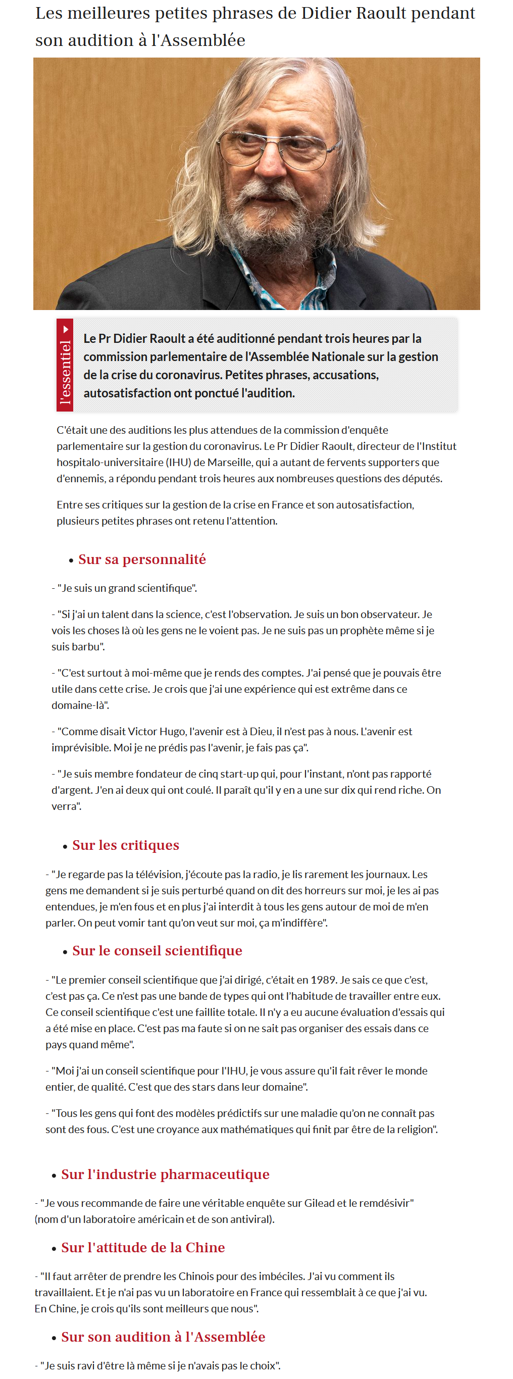 Le professeur Didier Raoult, éminent virologue marseillais,était auditionné mercredi après-midi dans le cadre de l'enquête parlementaire sur la gestion de la crise de l'épidémie.C'est une audition à l'assemblée nationale qui était très attendue dans le cadre de l'enquête relative à la gestion de la crise liée au Covid-19.Celle du Pr Didier Raoult, infectiologue et directeur de l'IHU méditerranée Infection à Marseille. Une personnalité réputée dans le monde de la microbiologie, mais que le grand public a découvert durant cette crise sanitaire.