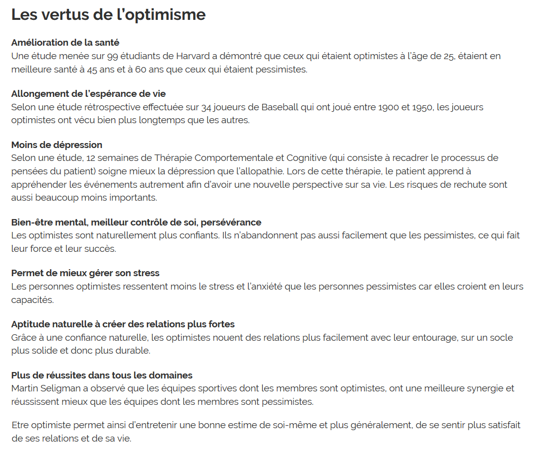 Outre les nombreuses études publiées à ce sujet depuis le siècle dernier (Université de Harvard dans les années 40, Département de Psychologie de la Mayo Clinic dans les années 60, University du Kentucky en 2001, Université de Pittsburgh en 2009), qui ont toutes démontré un niveau de santé plus élevé et une durée de vie plus longue chez les personnes optimistes.Selon une étude de Malakoff Médéric de 2017, la qualité de vie au travail est un facteur déterminant dans la performance de l'entreprise.Des collaborateurs heureux, motivés, optimistes, permettent une augmentation de la productivité. Une attitude négative en entreprise représente, en revanche, un plus grand risque d'erreurs.Le bonheur et le bien-être sont plus que jamais au coeur des approches de développement internationales. L'ONU a appelé ses membres, en 2011, à introduire le bonheur comme indicateur économique, prenant exemple sur le Bhoutan qui, depuis des années, a mis en place la notion de BNB (Bonheur National Brut) au sein de son économie. L'ONU a ainsi déjà réalisé deux classements de 156 pays en fonction de leur niveau de bonheur.